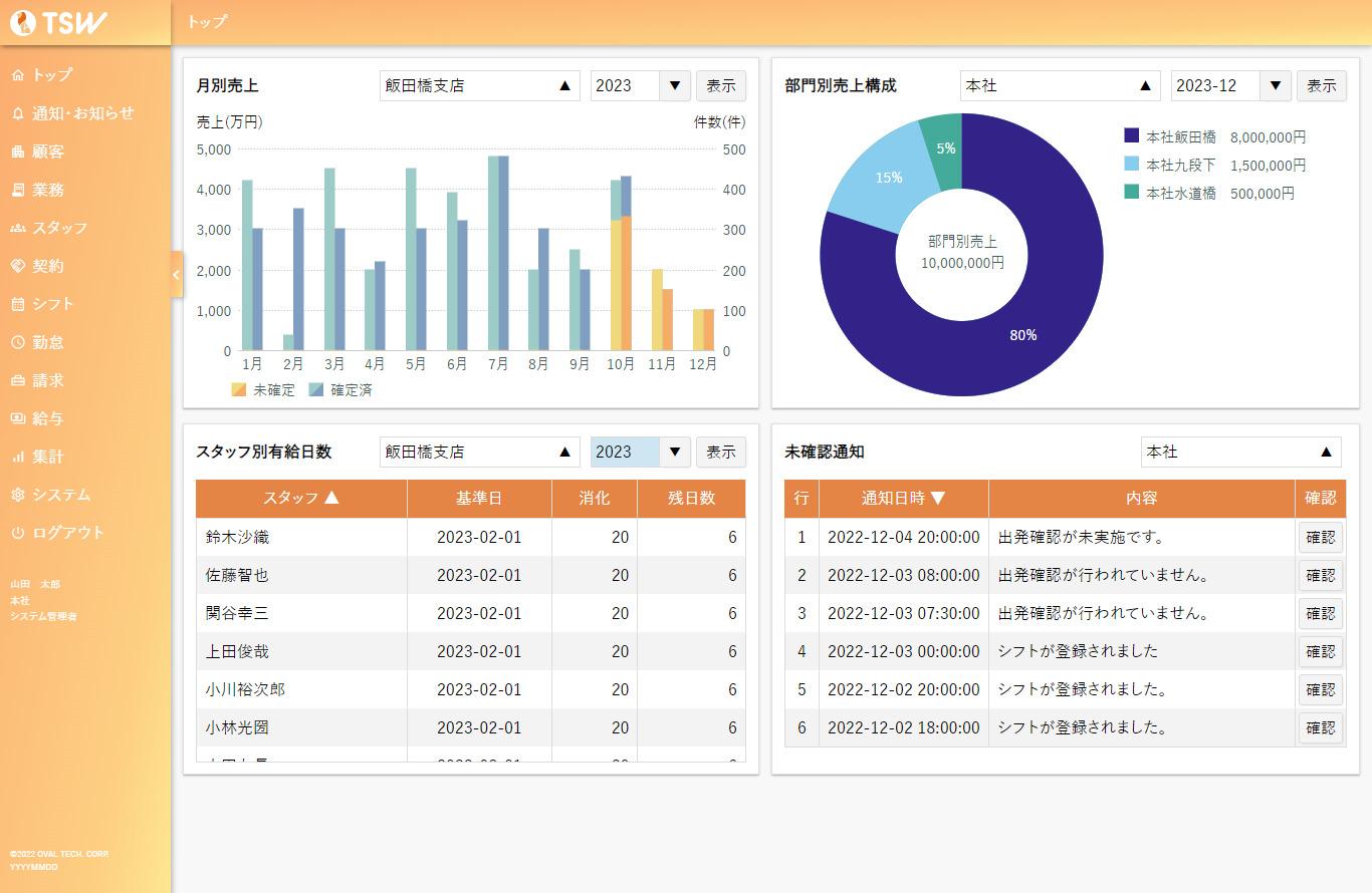 トップダッシュボード、月別売上と稼働人数などを表示