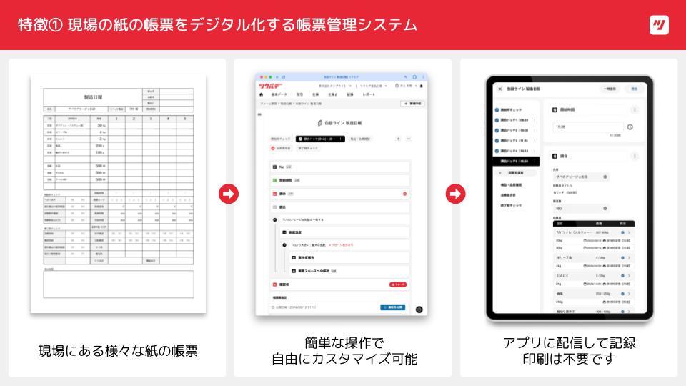 - デジタル化:食品製造現場の多様な紙の帳票をデジタル化しアプリで簡単に記録・管理