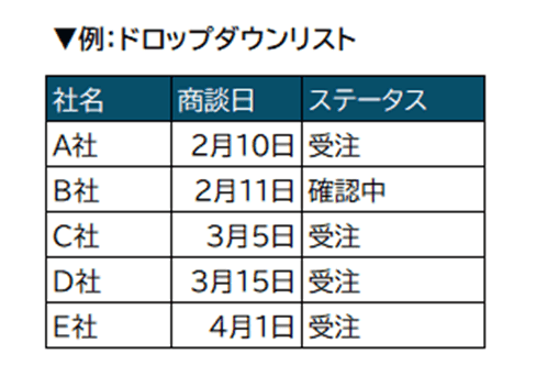 | ステータス | 商談の進捗状況を表す(例: 初回提案、見積提出、契約締結など)。 | ドロップダウンリストで選択肢を限定し、入力ミスを防止。 |