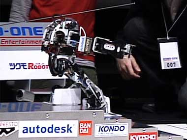 第5回ROBO-ONE優勝ロボットだ。高い運動性能を誇るロボットであり、期待も高まる。足を階段用のものに履き替えての登場だ。