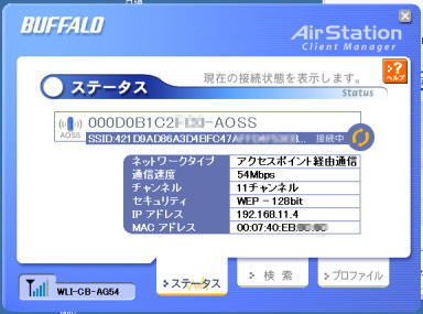 このようにして設定し直されたネットワークを、クライアントマネージャ2から確認してみると、確かにAESからWEPへと変更されているのがわかる(自動的に切断→IPアドレス取得と暗号化形式の変更が行われる)。