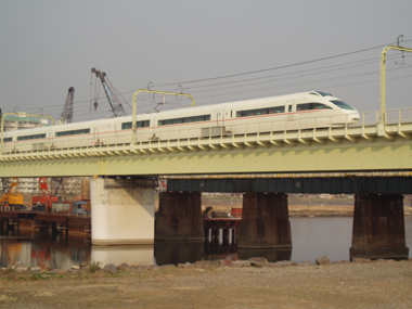 鉄橋を渡る新型ロマンスカー。テレ端で+1/3の補正をかけてある。やや日が傾き始めているとはいえ、赤みが期待より強く出てしまった。拡大してみるとディテールがざわついているのが気になる。