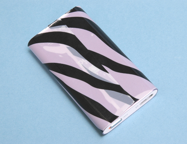 シールを貼っていないノーマルな姿(上。iPod miniシルバー)。iPod miniブルーに色とりどりのハートマーク柄「Heartbeats」を(左下)、iPod miniピンクにゼブラ柄「Zebra」を(右下)張ってみたところ。
