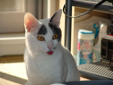 照明の色に影響されやすいのが白いペットの特徴。だから、部屋の照明やデジカメのオートホワイトバランス機能の効き具合によっては赤くなったり青くなったりしがちだ。そういうときはさっと色を合わせてしまうといい。