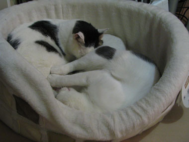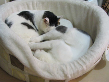 他にも露出補正の例を挙げてみよう。これは猫用ベッドに無理矢理入って、ともえ状に寝ている二匹である。