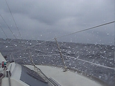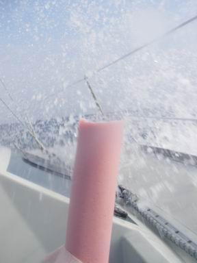 降りかかる波の迫力を撮影するなら風上舷がベスト。ただし、波そのものは小さく映るので注意。出来るだけカメラを高く構えて遠くまで見通せるアングルを確保したい。注意しないとバルクヘッドしか映っていないこともある。動画はこちら(AVI形式:4.37Mバイト)