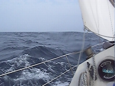 凪いだ海から一転して、風が吹いてきたら待ちに待っていた帆走、となる。快適快走と至福のときであるが、風が吹くだけに波も高い。船上はスプレーでずぶ濡れになるわけで、こうなってくるとオプティオ WPiの防水性能が威力を発揮する、と思張り切って撮影してみるが、当人にはえらく時化ているはずの海が撮った画像ではどうやっても「静かな海」にしか見えない。