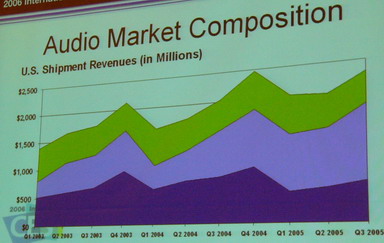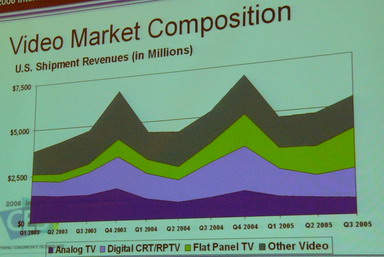 デジタルCRT/リアプロテレビ、フラットパネルテレビが増加してアナログテレビは減少と、従来と同じ傾向を示している映像出力機器に対し、オーディオ機器ではいったん落ち着いていたポータブルプレーヤーが2005年第2四半期から増加する傾向を見せている。