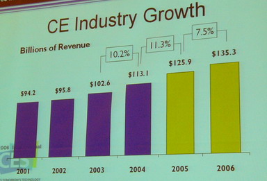 2005年の米国家電業界の売り上げは約1259億ドルに達し、2004年から2005年の成長率は11.3%となった。これは、その前の2003年から2004年の成長率10.2%を上回るもので、依然として米国の家電業界は好調である。しかし、CEAでは2005年から2006年の成長率を7.5%と低く予想している。