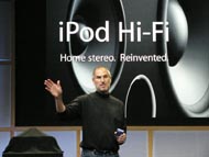2003年4月28日に米国でサービスが始まったiTunes Music Storeだが、3年弱で10億曲のダウンロードを達成した(左)。中央は記念すべき10億曲目のダウンロードを達成した米国在住のアレックス・オストロヴスキーくん。世界のMP3プレイヤー市場において、現在iPodは78%のシェアを獲得しているというジョブズ氏は次なる目標について、「“音楽を持ち運ぶ”という点で大きな成功を収めた次は、ホームユースにもっと目を向けなければならない。そのために必要なのはリビングルーム、寝室、キッチンなど場所を選ばずに配置でき、かつ高音質な再生環境が実現できる製品が必要だ」と述べ、そのための4つの目標を挙げた。それを実現するApple Computerからの提案が「iPod Hi-Fi」であり、BOSEなどのオーディオメーカーが出しているiPodドック+アンプ付きスピーカーと対抗する製品なのだという。