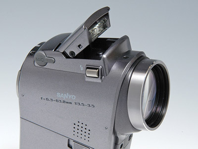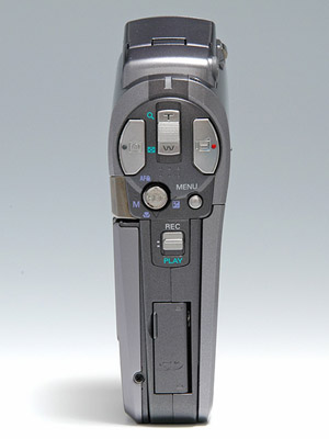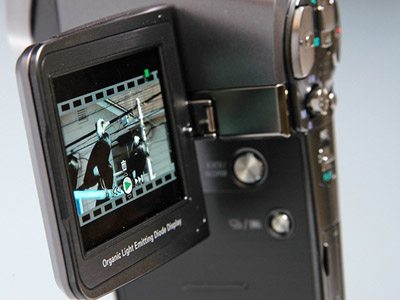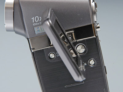 ディスプレイを開くと中に電源を含む3つのボタンが隠れている。ひとつは動画時のHDとNORMAL切替ボタン。もうひとつは静止画時の連写モードボタン。HDとNORMALを一発で切り替えられるのは便利。
