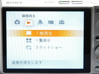 背面は液晶モニターが大きい割に右側にスペースが確保されている。円形の十字キーはさすがに両側がカットされているが。十字キーの下にあるHOMEボタンが今回のポイント。画面は再生モードだが、せっかくユーザーインタフェースを一新したのに、「モドル」「オンリョウ」など表記がカタカナなのは残念HOMEボタンを押すとクロスメディアバーのインタフェースとなり、左右のキーで「撮影モード」「再生」「メモリースティック」「設定」と基本的な作業を選び、上下のキーで下位の項目を決定する。