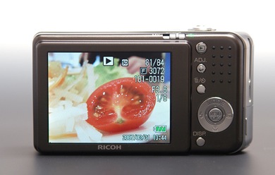 背面。ズームレバーとモード切替スイッチが移動したために非常にすっきりしている。親指が当たる箇所には小さなゴム足が張られ、安定感が増した。ボタンは上から再生、ADJ.、セルフタイマー兼削除、DISP.となっている。液晶モニターは2.7インチと大きめ電源スイッチは上面に。起動は非常に高速で、太い鏡胴がウイーンと飛び出てくる。当初のCaplio Rシリーズにみられた、無理して動作しているかのような危なっかしい感じはずいぶんなくなり、スムーズになった。