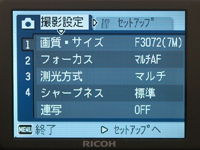 円形十字キーの中央にあるMENU/OKボタンを押すとタブで区切られたメニューが表示される。ここではフォーカスモード、連写、シャープネス、色の濃さ、手ブレ補正など細かくセッティング可能。