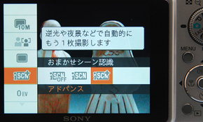 面白いのは「おまかせシーン認識アドバンス」モード。これにすると、微妙なシーンで2枚撮影してくれる。逆光と判断されたときは、フラッシュを使うときと使わないとき(使わないときはD-Rプラスが働く)、夜景は感度を上げた通常の設定と、低感度に抑えた設定。あとでうまくいったほうを選べばよいというモードで、使ってみると実に便利。