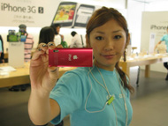 ボディデザインは変わらずにカメラとスピーカーが内蔵された(写真=左)。ビデオ撮影中の様子。ディスプレイも2型から2.2型に拡大(写真=中央)。本体が小さいのでビデオ撮影時はボディの角を持つようになる?(写真=右)即日販売を開始したアップルストア銀座には、いち早く実機を試そうとする大勢の人が訪れ、店内は平日にも関わらず混雑していた。なお、14時半ごろの様子ではまだ新モデルの入れ替え作業を行っている最中で、新型iPod nanoが展示されているのは1階の中央スペースのみ。まだ旧iPod nanoも並んでいたので、新旧モデルでボディの光沢感などを見比べたい人は銀座へ走ってみるといいかもしれない。
