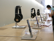 新型iPod nanoの展示は1階中央。多くの人が新モデルを手にとってスタッフの説明に耳を傾けていた(写真=左)。こちらはiPod shuffle(写真=中央)。入れ替え作業がまだ終わっていないため、取材時は旧iPod nanoも並んでいた(写真=右)