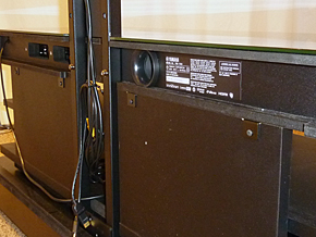壁にぴったり寄せてもバスレフポートの後ろに空間ができるようになっている(左)。従来機「YRS-1000」の背面。一見、スッキリしているように見えるが、壁にピッタリ寄せるとバスレフポートがふさがれてしまう。ケーブルの逃げ場もない(右)さらにもう1つ、実はオプションの壁寄せ金具もかなり進化している。実際問題として、メーカーにもよるが、薄型テレビの背面は意外と凸凹しているもので、汎用の壁寄せ金具では対処できないことが多い。このため、「壁寄せにしたければ純正シアターラックを選ぶのが無難」というのが販売の現場では通説になっており、先代のポリフォニーでも対応機種はかなり限られていた。しかし新製品では、金具(YTS-V1200、オープン価格)のレイアウトを工夫して、強度を維持しながらパナソニックや東芝、日立など、多くのメーカーの新製品に対応できるようになった。