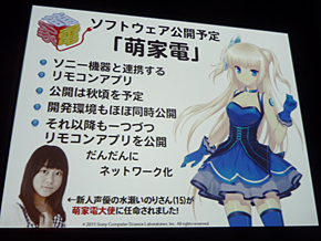 ユニークなのは、テレビやBlu-ray Discレコーダー、エアコンといった家電製品を擬人化し、アニメのようなキャラクターを作り出したことだろう。彼らがスマートフォンの画面に現れ、個々の機器操作やアップデートを指南したり、ストーリー仕立てのイベントをクリアすることで機器間連携のノウハウを教えてくれたりもする。秋にはソニー製品向けにAndroidアプリ「萌家電」が登場する予定で、同時に公開される開発環境「Kadecot」(カデコ)を使ってオリジナルのシナリオを作成することもできる(後述)。