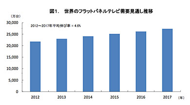 また、世界の薄型テレビ需要は、2012年に2億1799万台となった。日本や欧米は普及期が過ぎているため、今後は需要が横ばいになるものの、安定した経済成長が見込まれるASEAN諸国やBRICsなどの新興国で大きく需要が拡大。全体をけん引し、2017年には2億7342万台になると見込んでいる。