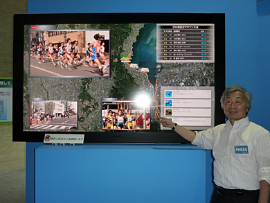 麻倉氏:展示では、琵琶湖マラソンの実況中継を例に、マラソンルートの地図情報や別アングルのカメラ映像を複数流すといった使い方を提案しました。別アングルの映像は、IP通信で取得したもの。前編でHEVCのフルHDへの応用について触れましたが、テレビにHEVCデコーダーが標準的に搭載されたら、AVCの半分の伝送容量でフルHD映像を持ってこられるため(IP通信)、複数のアングル映像を同時に映すといったことも現実的になると思います。