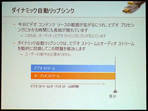 新しいダイナミック自動リップシンクは、「とくに映像と音声が別経路で伝送されるケース(ARCか、AVアンプ経由かなど)を想定した」という進化版だ。ビデオストリームとオーディオストリームのズレに対し、ダイナミックにバッファーの調整を行うことで動的に同期させる。ユーザーの操作は必要ない。