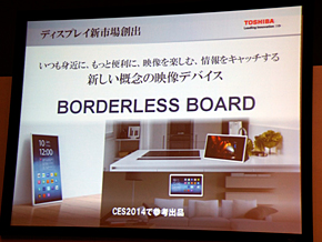 “使えるスマート”な機能を中心に、日本でも人気の「タイムシフトマシン」や「TimeOn」といった機能を積極的に海外展開していく(左)。新提案の1つとして、フレームレス・ミラーディスプレイという新しいタイプのディスプレイ装置をCESに参考展示する(右)2つめは「Borderless Board」と呼ばれる据え置き型タブレット製品。スペックなどの詳細は非公表ながら、写真や動画コンテンツの表示のほか、一般的なタブレット製品のようにメモボードやカレンダーアプリが用意されていて情報端末としても利用できるなど、提案型の製品になっているようだ。また4Kディスプレイを搭載したノートPCも参考展示が行われているが、とくにプロフェッショナルなビジネス用途での提案を重視しているとのことで、「東芝が強みとしているノートPC分野でビジネス市場に本格的に食い込むための戦略製品」という位置付けになっている。これまで4K表示に対応したノートPC製品は展示されていたことはあるが、実際に4Kディスプレイを搭載した製品は初となる。