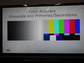 左は動画チェックに使われるテストパターン2つ。左はグラデーションを表示してバンディング(縞模様)が出ないことを確認する。もう1つは左右に動かして鮮明さ(解像度)をチェックする。右は色の検査に使われるグレースケールとカラーパターン。色はRec.709というスタジオカラーを再現できるかが問題になる実際の認証プロセスは2段階あり、まず製品のプロトタイプでテストを行い合否を判断する。さらに合格した製品の量産が始まると、量産機でプロトタイプと同じ性能が出ているかをチェックする。もちろん最初のテストを1発で合格することは極めて難しく、指摘された部分を改善して再試験を受けるといったことをメーカーは繰り返すのだ。