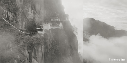 「聖地」をテーマに、エジプト、ヨーロッパや南米、カンボジアのアンコールなど、世界各地の石造遺跡などの撮影をライフワークとするアメリカ在住の写真家・井津建郎氏は、2007年までの6年をかけてブータンを撮影。国中が聖地ともいえるようなブータンの大地、文化や人々を特製の大型カメラで記録し、14×20インチの大きなネガを密着焼き付けしたプラチナ・プリントを制作しています。