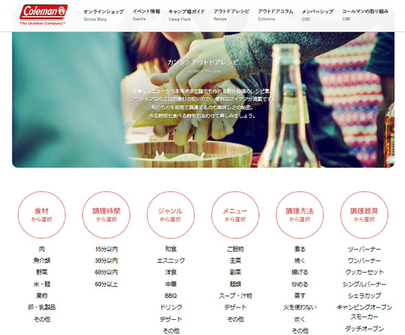 コールマンの公式サイトでは「キャンプ場ガイド」や「アウトドアレシピ」など、アウトドア専門店ならではの情報を掲載しています。
