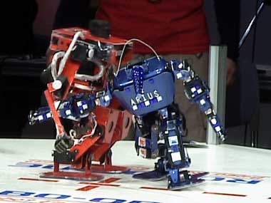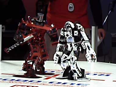 2325-RXは指先を使って敷物を敷いて上を前転、OmniStrikerは、ボールを拾ってキックとお互いお得意のデモンストレーション。でもOmniStrikerの蹴ったボールはうまく飛んでくれない。足の怪我の影響か?