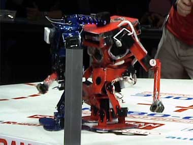 両者とも、ラウンド間の調整を行う。2325-RXは、高い運動性能を出すためにサーボモータにかなり負担をかけている。熱くなるのだ。冷やすために、風を送るだけでは足りずに、冷却スプレーまで吹き掛ける。一方OmniStrikerは、電池を交換してすぐにリングに戻す。