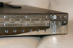 底面にある自立のための4つの「足」。これも当然同じ金属が採用されているが、鞄その物が非常に薄く、スマートな半面、足のコンパスを広く取ることが不可能で、転倒する危険性が大きい。4つの足は、アタッシェケースをを開いた時に、開きすぎないように直角に近い適度な確度で固定するストッパーの役目も果たしている(左) 底面の蝶番(ちょうつがい)部分には「MS20001-2」と誇らしげにミリタリースタンダードである証明の印字がされている。確かに蝶番は精度が高く、アタッシェケースの蓋を閉まる間際まで手でもって行き、自重を利用して軽く落とすだけで、見事に気持ちよい音を立ててロックされる(右)Copyright © ITmedia, Inc. All Rights Reserved.