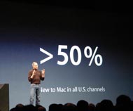 ジョブズ氏は昨年を振り返り、例年のようにMacやiPod、iTunes Storeといった同社製品の現況報告からスピーチを開始。わずか1年前(つまりMacworld Expo 2006/SF)に始まったMacのIntel CPUへの移行により、Macへの乗り換え需要が進んだ点を挙げて、同社のビジネスが順調に推移していると説明した。