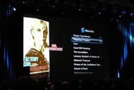 正式名称は「Apple TV」(写真=左)。背面にUSB 2.0と有線LAN、HDMI、コンポーネント、RCA、光オーディオを備える(写真=中央)。iTunes Storeから最新映画のトレーラをストリーミングしたり別のMacからの再生も可能(写真=右)その後バックスクリーンには、“最初の30年ははじまりにすぎない”のメッセージで使われているあのロゴが表示され、会場内のどよめきとともに舞台は緊張に包まれる――。