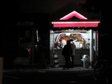 これも三脚で撮影。シャッタースピードが1/2秒くらいだから手持ちではさすがに撮れないのだ。マイナスの補正をかけてオートで撮影。暗い街にぽつんと明るく輝いてるクレープ屋さん、という図。マイナス補正でわざと周辺を暗くして「ぽつん」という感じを出してみた。