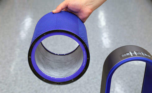 空気清浄機能のキモは、「360°グラスHEPAフィルター」と呼ばれる円筒形のフィルター。フィルター1つあたり1.1平方メートルのマイクロファイバーを使用し、254層折りのプリーツ状に加工したもので、1日12時間動かしても1年間は使用できるという。HEPAフィルターの交換作業は簡単。本体からループ部を外し、円筒形のフィルターを上に引き抜くだけでいい。交換用フィルターの価格は6000円(税別)となっている。
