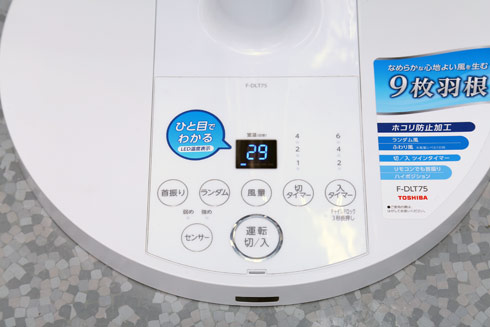 東芝の「F-DLT75」は、トラディショナルなスタイルの扇風機に温度センサーなど今風の機能を追加したモデル。室内の温度を感知して風量を自動的にコントロールしてくれるほか、暑がりの人向けの「強めモード」とお年寄りや赤ちゃんに適した「弱めモード」の選択も可能になっている。