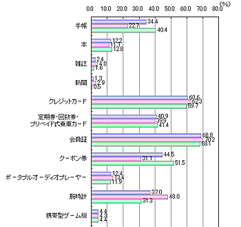 「携帯電話と現金を除き、外出時にどのような物を持ち歩いているか」という質問に対して、男性「会員証」が70.2%でトップ。次いで「クレジットカード」「腕時計」「定期券・回数券・プリペイド式乗車カード」となった。女性では「リップクリーム」(68.3%)が最も多く、「会員証」と「口紅・グロス」も60%を超えた。