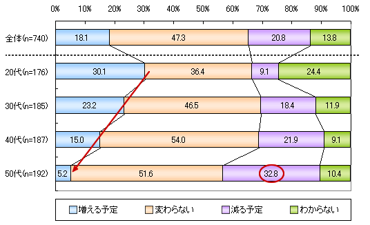 冬のボーナスの支給予定がある人(71.7%)で、昨年の支給額と比較して「減る予定」の人が多く20.8%、「増える予定」の人は18.1%。年代別でみると、増える予定の人は年代が高くなるほど低くなり、50代ではわずか5.2%、逆に減る予定の人は32.8%に達した。