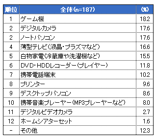 ボーナスで家電製品を購入する人は、「ゲーム機」が最も多く18.2%、次いで「デジタルカメラ」と「ノートPC」がそれぞれ17.6%だった。電通が発表した「消費者が選んだ2007年話題・注目商品」(別記事参照)では、任天堂のWiiとニンテンドーDS Liteが1位、2位を独占。冬のボーナスで任天堂のゲーム機を買う人が多いのかもしれない。