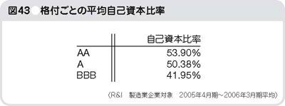 これらが「借入で資金調達をする際のコスト」ということになります。これだけから判断すると、「AA」格のほうが負債の調達コストが安いので、企業は「AA」格の格付を取得するべき、と思ってしまいますが、いちがいにそうとも言い切れません。「AA」格の格付を取得するためには自己資本比率を高める必要があります(図43参照)。