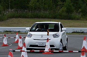 一方で、街中の利用を模した狭路走行コースでは、最小回転半径3.9メートルという“小回り”の性能を遺憾なく発揮。狭い道でもクイクイと曲がり、わずかなスペースでの車庫入れやUターンもこなす。しかし、iQは全長は驚異的に短いのに全幅は普通車並みというある意味トリッキーなサイズで、しかも最小回転半径はとても小さいので、初めての狭路走行コースでその動きに戸惑うこともあった。頭で想像する以上に「小回りが利きすぎる」ことにヒヤッとさせられたのだ。また、コンパクトカーなのに前後左右の見切りはそれほどよくない。逆説的だが、初めてiQに乗ったときは小回りのよさに慣れが必要かもしれない。