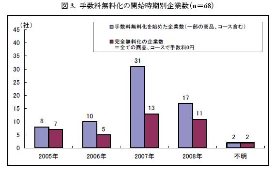 FX業界では年々手数料競争が激しくなっているが、取引手数料を「完全無料化」している企業は31.1%、「一部の商品、コースで手数料を無料化」が24.6%、「すべての商品、コースで手数料を徴収」が44.3%。取引手数料を無料化している55.7%(68社)のうち、完全無料化が始まったのは2005年から。同年2月にエフエックス・オンライン・ジャパンが導入を始めたほか、MJやFXCMジャパンなど7社が無料化に踏み切った。また2008年に入っても、手数料無料化の商品やコースを提供した企業は17社と、無料化を実施する企業は年々増加している。
