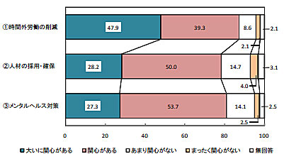 労働者側の81.4%は「仕事と家庭(育児・介護)」に“関心がある”と回答したのに対し、経営者側は63.0%。また「時間外割増率の引き上げ」についても、労働者側の60.5%は“関心がある”と回答したが、経営者側は42.9%と、労使の間で差が見られた。