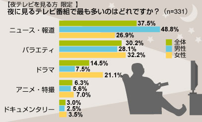 最もよく見る番組ジャンルについて聞いたところ、朝は「ニュース・報道」(77.8%)が断トツ、次いで「情報番組」(17.9%)、「アニメ・特撮」(2.7%)と続いた。一方の夜も「ニュース・報道」がトップだったが、その割合は37.5%。以下「バラエティ」(30.2%)、「ドラマ」(14.5%)と、「ニュース・報道」に偏りがちな朝と比べ、夜に見る番組ジャンルは幅広いようだ。