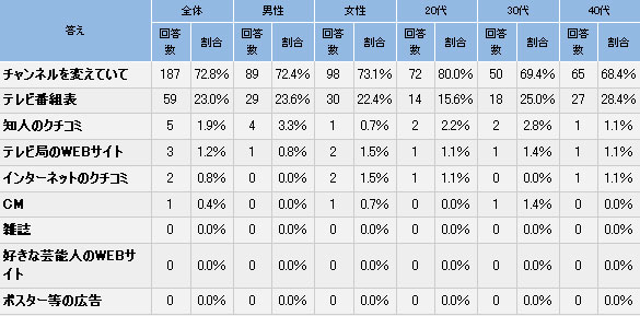 よく見る番組を知ったきっかけについて尋ねると、朝の時間帯では「チャンネルを変えていて」が72.8%でトップ、次いで「テレビ番組表」(23.0%)。夜の時間帯では「チャンネルを変えていて」(45.0%)と「テレビ番組表」(40.2%)とが僅差で並んだ。「忙しい朝はリモコンでチャンネルを変えながらお気に入りの番組を見つける場合が多いが、比較的時間を取りやすい夜は『テレビ番組表』を参考にし、お気に入り番組を見つける人が多くなるようだ」(アイシェア)