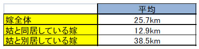 嫁姑は別居した方がいいという人が圧倒的多数だが、「姑と別居するなら、姑と仲良くいられそうなお互いの住まいの距離は何キロですか?」と聞くと、平均は25.7キロ。これはJR新宿駅〜立川駅(直線距離で25.9キロ)やJR新橋駅〜横浜駅(同25.5キロ)の距離とほぼ同じ。また、姑と同居している女性の平均は12.9キロだったが、別居している女性の平均は38.5キロだった。