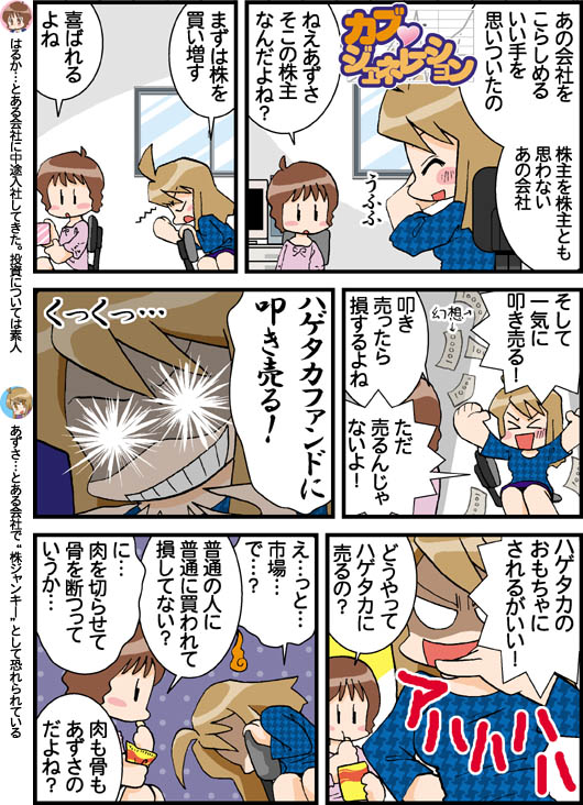 どうしたら企業を困らせることができるのか。そこで浮かんだ彼女なりの回答が、外資ファンド。一時期は「ハゲタカ」の悪名をとどろかせて市場を席捲したものですが、別段悪いものではないような気もします。「企業を安く買って、経営を再建させて、価値(株価)を上げて高く売る」……いい仕事ではないですか。会社の経営を立ち直らせる過程で、事業の縮小や人員のリストラが発生するため、悪いイメージを持たれがちなのが難しいところです。