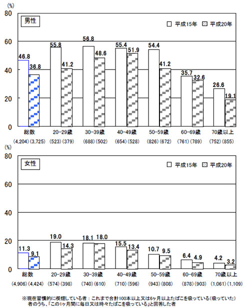 厚生労働省は11月9日、「2008年国民健康・栄養調査結果の概要」を発表、現在習慣的に喫煙している人の比率※は男性が36.8%(2003年調査46.8%)、女性が9.1%(同11.3%)と5年前に比べて大幅に減少していることが分かった。